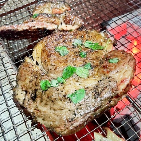牛ロース100g、豚バラ80g、BBQチキン50g、厚切りベーコン50g、骨付きソーセージ1本、焼き野菜1人前
